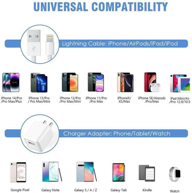 Charger Cord Broad Compatibility: Apple iPhone 14/14 Pro/14 Pro Max/14 PlusiPhone 13/13 Mini/13 Pro/13 Pro MaxiPhone 12/12 Mini/12 Pro/12 Pro MaxiPhone 11/11 Pro/11 Pro MaxiPhone X/XR/Xs/Xs Max/SE 1/2/3iPhone 8/8 Plus/7/7 PlusiPhone 6/6 Plus/ 6S/6S Plus/5/5S/5CiPad Pro 12.9" /11"/ 10.5" / 9.7" iPad Air 1/2/3iPad mini 1/2/3/4/5/6iPad 5/6/7/8/9Apple AirPods 1/2/3/Pro/Max and