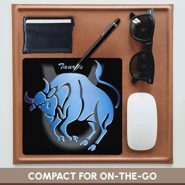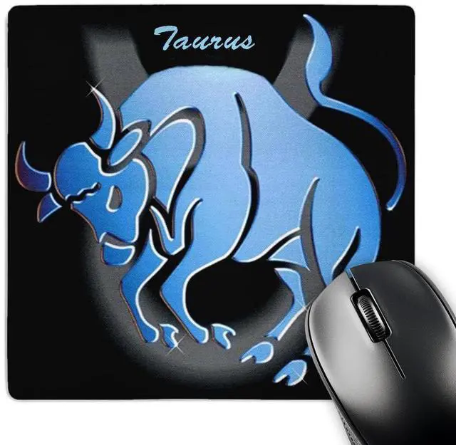 Taurus Zodiac Sign Mouse Pad is 8" x 8" x. 25" and is made of heavy-duty recycled rubber. Matte finish image will not fade or peel. Machine washable using a mild detergent and air dry.