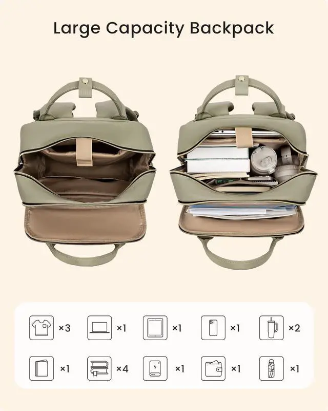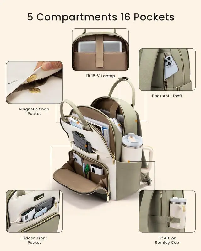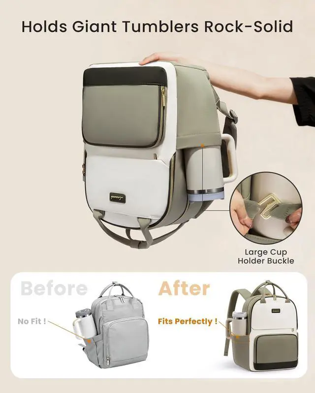 DUAL GIANT WATER BOTTLE POCKETSNever Leave Your Stanley Behind! Securely fit your massive Stanley Quencher or favorite water tumbler in both upgraded side pocketsno more will it fit? stress. Stay hydrated effortlessly on commutes or non-stop teaching/working/studying days! ^^ 27L HUGE CAPACITY Say Goodbye to Packing Anxiety! With an extra-large 27L capacity, this backpack easily fits your laptop and other electronics, wallet, notebooks, lunch, cosmetics, clothing, and all your daily or travel essentials. ^^ 5 COMPARTMENTS WITH 16 SMART ORGANIZERSNo More Black Hole Work Backpack! 16 specialized compartments and pockets keep work gear and personal essentials perfectly sorted.