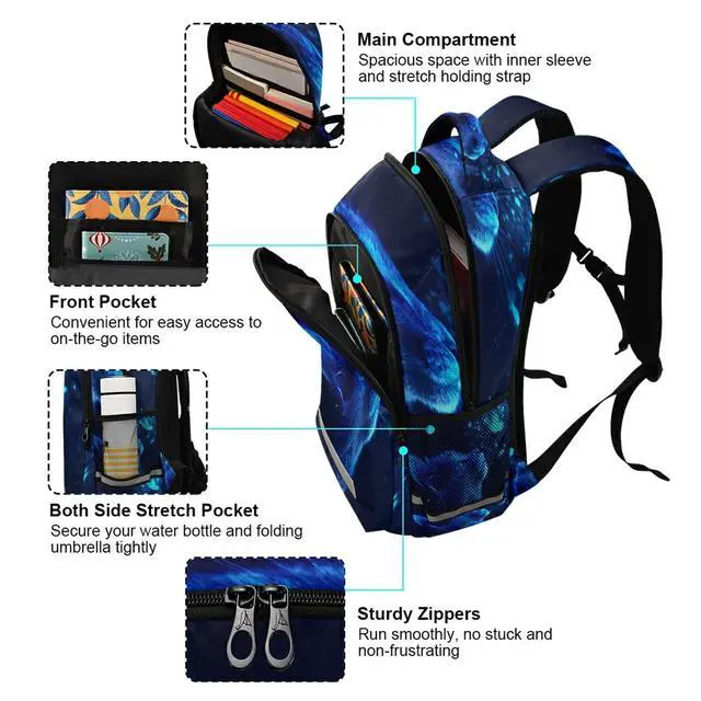 Use: Suitable for any occasions, like school, weekend getaway, daily travel, hiking, picnic, cycling, climbing and any other outdoor activities. Large Capacity1 main compartments and 1 laptop sleeve. Easy access laptop and iPad compartment separate from roomy main compartment. 1 inner zipper pocket place your wallet or phone which is anti theft. 2 side net flexible pockets adjusts to fit a water bottle or umbrellas. the front zipper pocket can place some things that are often used, such as keys, tissue, pens. Plenty capacity design, most of your daily necessities can be loaded. Personalized graphics, exclusive designs for you, make you special and unique. It will catch everyone's eyes. It is available for all types of occasions and multifunctional. It can be use as kids school backpack, laptop backpack/bags/sleeves, travel backpack, sport backpack, duffel bag and other outdoor activities. Kids will like it. And the lining is easy to clean. All ALAZA' products are customized and personalized. Please be confident with ALAZA backpack.