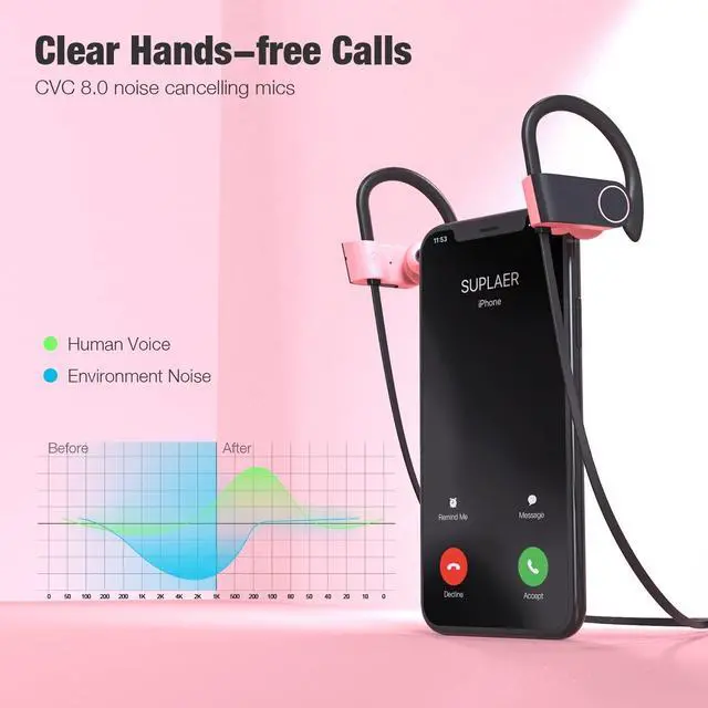 [Stereo Sound Quality] Powered by 16mm dynamic driver and in-ear acoustic structure, wireless headphones presents a powerful and wide sound range, which makes the treble full of dynamics and the bass powerful. ^^ [Up to 16 Hours of Playtime] Bluetooth headphones delivers 16 hours of superior audio performance / talk time, which gives you excellent experience of long endurance. ^^ [Ergonomic Design for Sports] Ergonomic design provides a comfortable and secure fit that doesnt protrude from your ears especially for Sports, Workout, Gym. Equipped with 4 pairs of ear caps to ensure your running headphones fit comfortably and noise cancelling in ear.