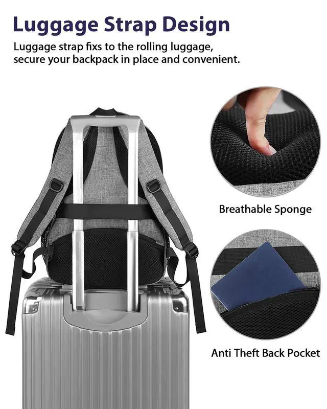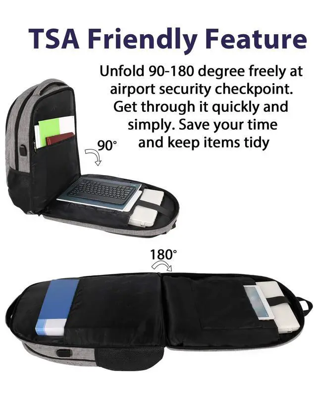 TSA Approved Backpack: TSA personal item travel bag 20l is designed for airplane flight travel. The 15.6 laptop backpack can unfold 90 to 180 degrees, making the laptop bookbag get through airport security checkpoint more easily and quickly. This 15.6 inch computer backpack is lightweight enough for daily commuter, school, college, daily use ^^ USB Charging Port & Luggage Sleeve: 15.6 inch theft proof computer backpack with external USB charging port and built in charging cable can conveniently charge phone, tablet and other electronic devices while walking. Featuring the trolley belt on laptop backpack 15 inch breathable back, business traveler could fit casual dailu backpack right on the luggage suitcase, which free your hands ^^