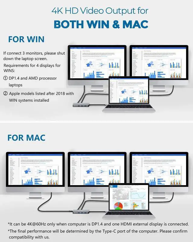 Please NoteThe Mac OS itself does not support extended screen effect. LASUNEY 10 in 1 Hub achieving the extended mode by the following steps needed from you: Setting, Display, Arrangement, Cancel Mirror Display, And please drag the setting box to the page of the external display. Then you can get 1 display of HDMI1=HDMI2=DP, 1 display of your Macbook. Totally two different contents for Mac OS ^^ Vivid 4K Output and Mutiple DisplayMirror or extend your display with HDMI ports and DP Port, directly stream High Definition 4K video to televisions, monitors, or projectors for a cinema visual feast. Under extended mode, you can enjoy up to 4 multiple display(Needs your source devices support DP 1.4 and has AMD graphics card). For collage mode, our