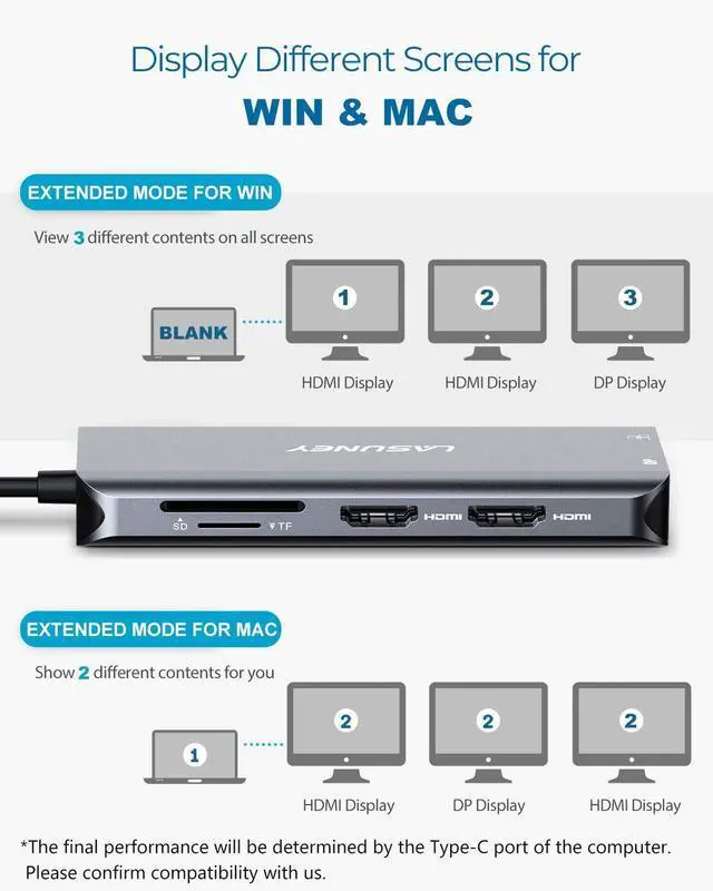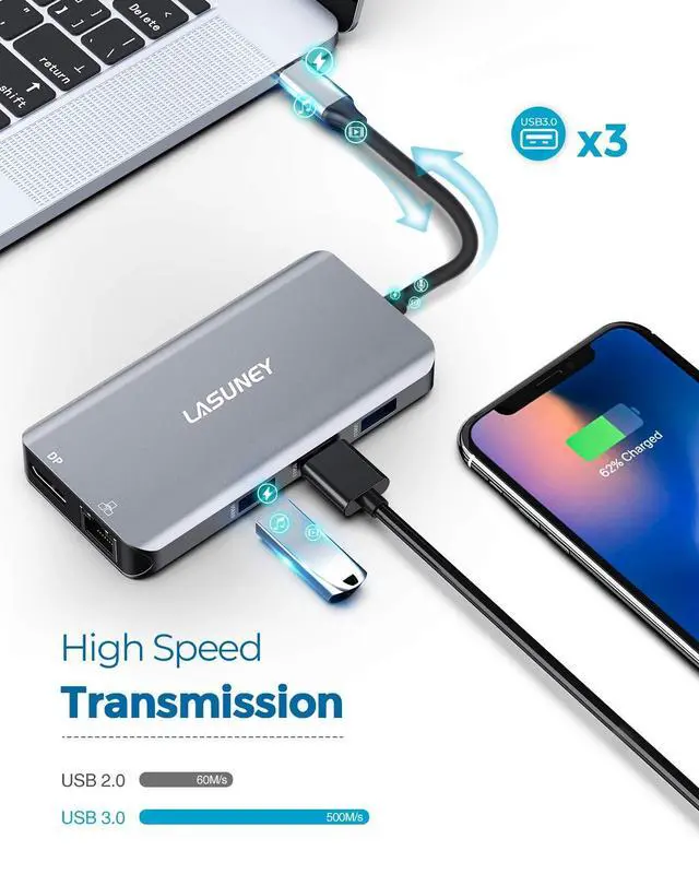 hub support triple display: one HDMI output, 1 HDMI=DP and 1 laptop screen. But Only Windows system support multiple display, Mac does not support ^^ Reliable and Ultra Fast Data Transmission2 USB 3.0 ports and 1 USB 2.0 port. The transmission speed of USB 3.0 is 8 times that of USB 2.0, support transmission speed rates up to 5 Gbps. USB 2.0 is compatible with more devices. Built in SD and TF slots for easy access to files from universal SD and Micro SD Memory Card, support 2 cards reading simultaneously. 1000 megabits per second Ethernet port standby for laptops without Ethernet sockets when wireless network fails ^^ Power Delivery 3.0LASUNEY Multiport USB C adapter provides 1 Type C pass through female port by which you could charge MacBook or other Type C laptops. It supports 100 watts power in and power out that is limited to 87 watts for safety ^^ Stylish Design and Wide CompatibilityLASUNEY 10 in 1 USB C Hub is made of thin and sleek precision milled aircraft grade aluminum enclosure, light enough to take with you anywhere. Space gray reflects your business professionalism. It is an ideal USB C hub for most Type C laptops on the market, such as MacBooks, ChromeBook Pixel, and laptops from Dell, HP, Lenovo and so on
