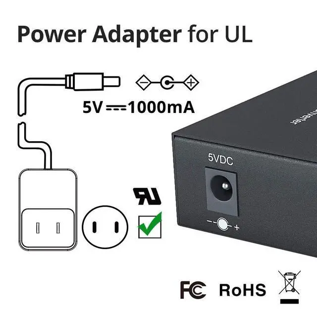 Power Supply: 5V-1A, UL Certified. ^^ Supports jumbo frame size 9K bytes and working temperature range from 0C to 60C.