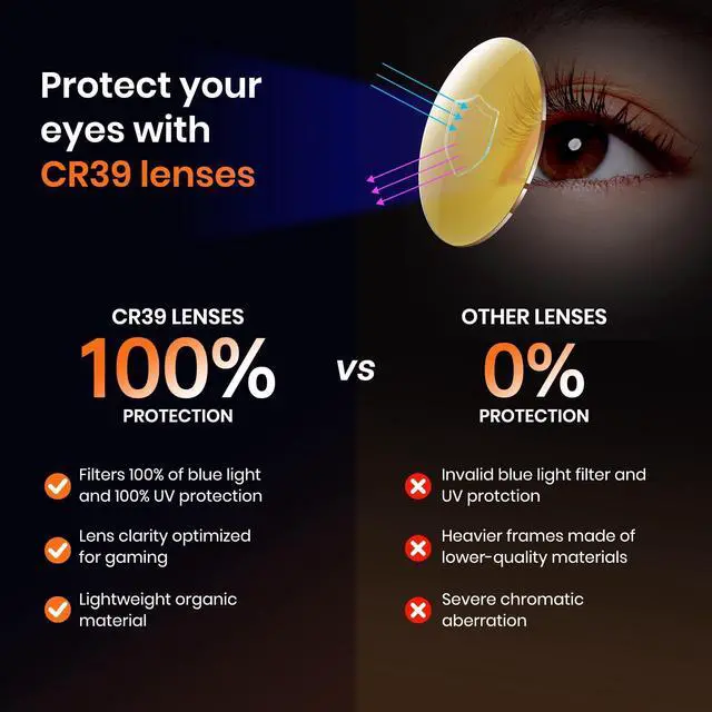 Advanced CR39 Lens Technology: Crafted from high-quality CR39 material, these lenses offer superior clarity and lightweight comfort. They efficiently filter out 99% of blue light, which is known to cause eye strain and disrupt sleep patterns, ensuring your eyes stay healthy and rested ^^ Enhanced Gaming PerformanceExperience improved focus and reaction times as our glasses reduce glare and increase visual clarity, giving you a competitive edge in your favorite games ^^ Long-Session ComfortUltra-lightweight frame combined with ergonomic design ensures comfortable wear during extended gaming marathons, letting you play longer without discomfort ^^ Complete Eye ProtectionBeyond blue light filtering, enjoy full UV400 protection and anti-reflective coating, safeguarding your eyes from multiple sources of strain and potential damage ^^ Versatile Gaming CompanionPerfect for all types of gamers - PC, console, or mobile. These glasses optimize your visual experience across all gaming platforms and everyday digital activities