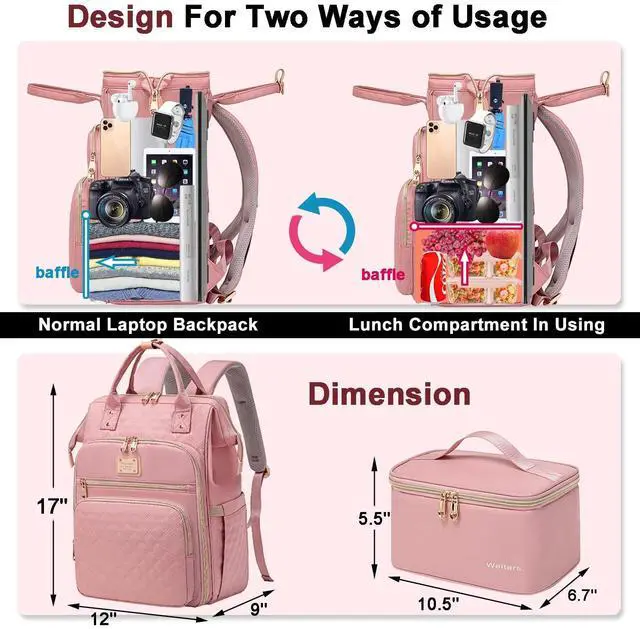 Laptop Backpack With Lunch Compartment2 In 1 Laptop Backpack With Lunch Compartment; The Work Backpack Measured By L12 * W9* H17, And The Separate Lunch Bag Measure By L 10.5 * W 6.7 * H 5.5; Good Fit As Lunch Backpack When You Put The Lunch Bag Into Women Backpack And Lift Up The Baffle Inside; And It Can Also Take It As Laptop Backpack For Women When You Put Down The Battle When You Take Out The Lunch Bag And Save Roomy Space ^^ Independent Lunch CompartmentThe Lunch Bag Is Detachable From The Women Laptop Backpack.