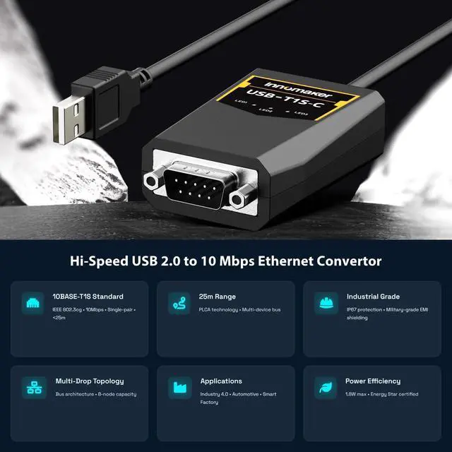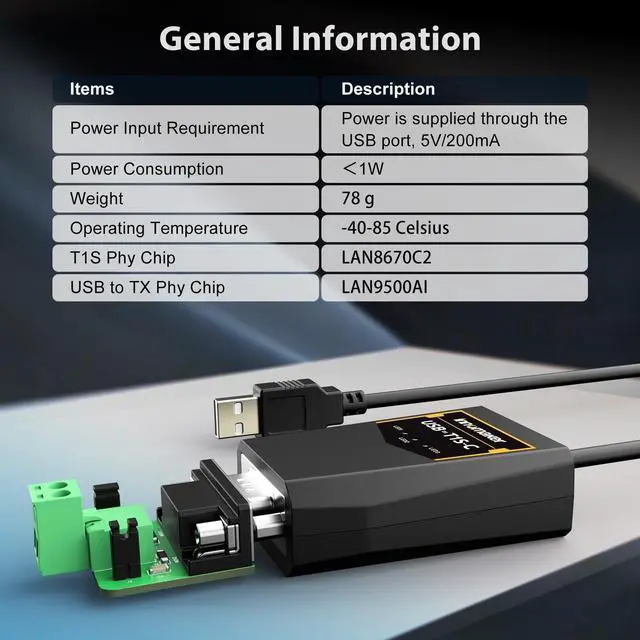 Hi-Speed USB 2.0 to 10 Mbps Ethernet convertor, to interconnect a USB interface with a IEEE 802.3 cg 10BASE-T1S Ethernet network interface. The convertor serves as a network card that connects applications via USB 2.0 to the 10BASE-T1S network interface. ^^ Support multidrop mixing segments and physical layer collision avoidance (PLCA). ^^ 10BASE-T1S single-pair Ethernet physical layer transceiver LAN8670. ^^ Industrial-grade design with built-in ESD protection devices ensures strong anti-interference capabilities, protecting signal lines within the device from electrostatic discharge (ESD) and surge interference. ^^ The device uses a USB Type-A connector and a standard DB9 terminal.