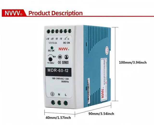 NVVV MDR-60-12 AC to DC DIN-Rail Power Supply 12V 5 Amp 60W, Blue+White