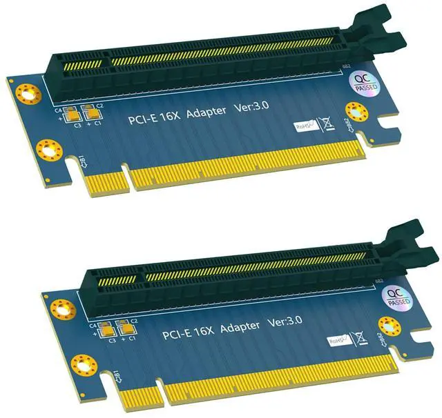 Upgrade your PC setup with these premium PCIe 16x riser cards, designed to provide flexible GPU mounting solutions. This 2-pack of 90-degree adapters allows you to redirect your graphics card positioning while maintaining reliable PCIe 3.0 connectivity. The male-to-female design features sturdy construction with turquoise retention clips and gold-plated contacts for optimal signal integrity. These adapters are perfect for custom PC builds where space is at a premium or when you need to adjust your GPU orientation. The built-in slot protection helps prevent damage during installation and removal, while the precision engineering ensures compatibility with standard PCIe 16x graphics cards.