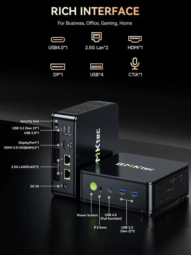 Network Speeds: Enjoy up to 2500Mbps data transmission speed without worrying about lagging. Ideal for working, gaming, and surfing the internet. Great for Untangle, Pfsense or as a server office PC. ^^ TRIPLE 4K DISPLAY - Unlock unparalleled productivity with support for three simultaneous displays, including a stunning 8K@60Hz via USB4, plus 4K@60Hz through both HDMI 2.0 and DisplayPort, transforming your workspace into a command center for multitasking and immersive entertainment. ^^ FAST INTERNET WiFi 6 + BT 5.2 CONNECTION - Experience next-generation WiFi 6 for ultra-fast, low-latency internet on 2.5G /5G bands, paired with Bluetooth 5.2 for instant peripheral connections. BT 5.2 allowing you more quickly to connect other wireless devices (headset, mouse, keyboard, etc. ) Interface features 3*USB 3.2 (Gen2) ports, 1*USB 2.0 ports, 1*HDMI 2.0 port(4K@60Hz), 1*USB 4.0 port(PD/DP/DATA), 1*DP Port, 1*Audio 3.5 mm (HP&MIC), 1*DC Power Port. ^^ GMKTEC WARRANTY - GMKtec offers a 1-year limited warranty for each mini PC, starting from the date of the purchase. All defects due to design and workmanship are covered. With a professional after sales team always ready to attend to your needs, you can simply relax and enjoy your mini PC.