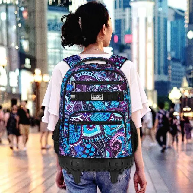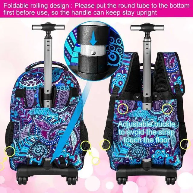 Important tip: keep the straps tucked inside the padded back panel when not in use, DO NOT wobble the rod. ^^ MULTI-POCKET & LARGE CAPACITY -21 inches large rolling travel backpack, 3 big pockets with zipper and 2 side mesh pockets for a big storage. Inside compartments in wheeled backpack are convenient for organize and storing items. ^^ Rubber Base Design - Molded rubber bottom holds up to the punishment of dragging sideways and backwards on pavement. Will avoid destroy in the bottom of your rolling backpack. ^^ Ingenious Handle - The backpack with wheels is constructed with T-shaped telescoping handle, which is made of high density PU coated materials and aluminum pipes, provides a firm comfortable grip.