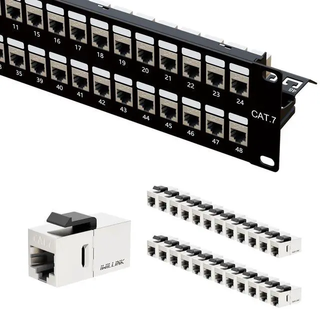 1. Iwillink 48 Port RJ45 Through Coupler 2U Cat7 Patch Panel STP Shielded 19-Inch with Back Bar, Wallmount or Rackmount, Compatible with Cat5, Cat5e, Cat6, Cat7 Cabling 2. Shielded Female to Female cat6 keystone jack can be used connect two Cat5e/Cat6 Ethernet network cables.