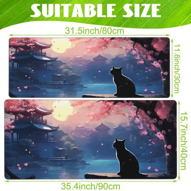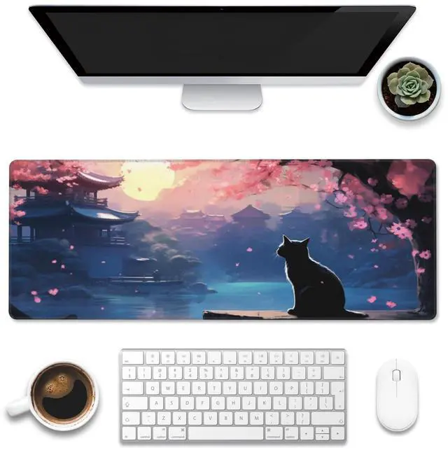 Eflxamz Desk Mat, Black Cat Under Cherry Blossom Tree Desk Pad, Japanese Scenery Large Gaming Mouse Pad with Non-Slip Base and Stitched Edge, 31.5"x11.8"