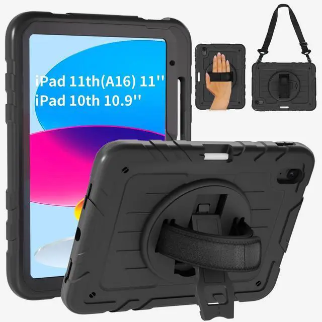 Model: A3354/A3355/A3356/A2696/A2757/A2777. Main Features3 in 1 CaseCombined with hard PC front & back inner cover, soft silicone outer cover. 360Rotatable Kickstand & Hand StrapA unique feature of this case for iPad A16 11th/ 10th Generation Case is its kickstand that supports your tablet in a stand position through multiple angles, and a 360-degree swivel hand strap which adds extra comfort for holding with pencil holder. Whether it is a child or an adult, you can adjust the tightness of the strap so that users are comfortable using their own tablet. The hand strap can also rotate along with the turntable in the middle. We have also included a strong, adjustable shoulder strap which can be connected to the integrated looping holes of the case. Excellent ProtectionThis high-quality 11th Generation A16 case offers maximum protection, ensuring the life of your tablet. This case for iPad 11th/10th gen case is suitable for kids, Schools, Builders, Workmen and others that need to use their tablet in conditions and scenarios where a normal case just won't do! Package1 x case for iPad A16 11th/10th Generation 11Inch / 10.9 Inch Case1 x User Manual1 x Cleaning Cloth1 x Installation Tool1 x Shoulder StrapService6 months maintenance or replacement service for product defects.