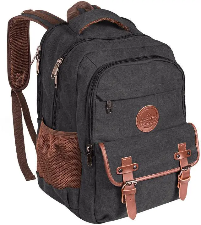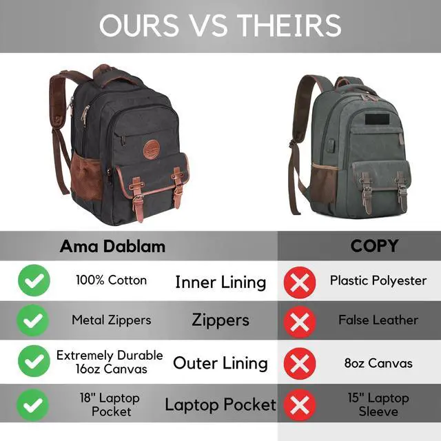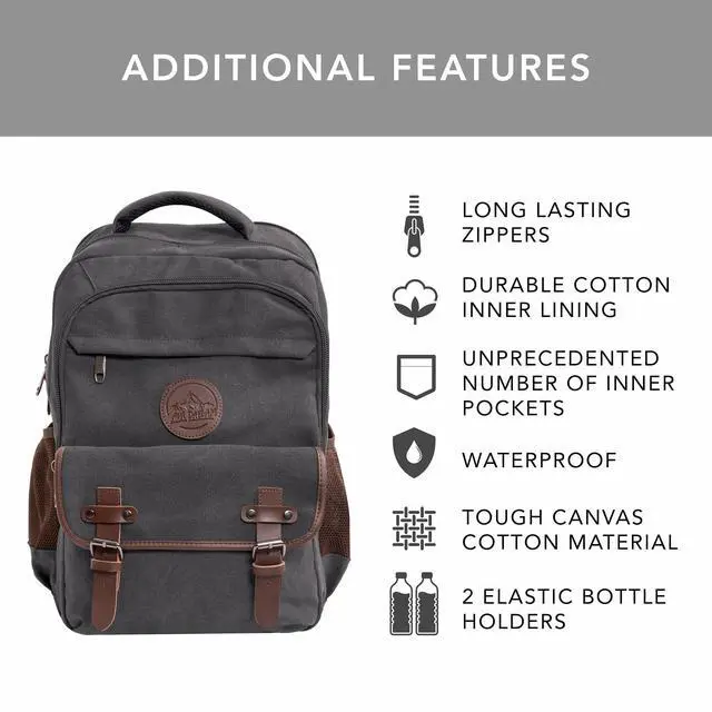 [Built for Durability/ Premium Quality] - Crafted from thick and tough 16oz canvas cotton, with durable zippers, premium stitching and sturdy cotton inner lining. Carry laptops, cameras, clothes, and gadgets with a premium feel and style. ^^ [Separate Laptop Sleeve & Ventilated Back] - Measures 18x12x7 with a 30L capacity. Features a padded sleeve for up to 17 laptops and breathable back and straps for added comfort. ^^ [Ample Storage Options] - Includes 2 side water bottle pockets, 1 front zipper pocket, 1 front button pouch, 2 large main compartments with a Separate padded laptop compartment, plus smaller interior pockets for pens and phones.
