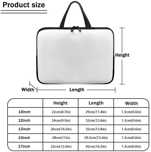 Size: 10 inches-8.7H*11.4L*0.6W; 12 inches-9.5H*12.6L*0.6W; 13 inches-10.2H*13.8L*0.6W; 15 inches-11h*15.6L*0.6W; 17 inches-12.6H*16.5L*0.6W inches. We offer multiple sizes for you to choose from, which can perfectly fit your computer size.