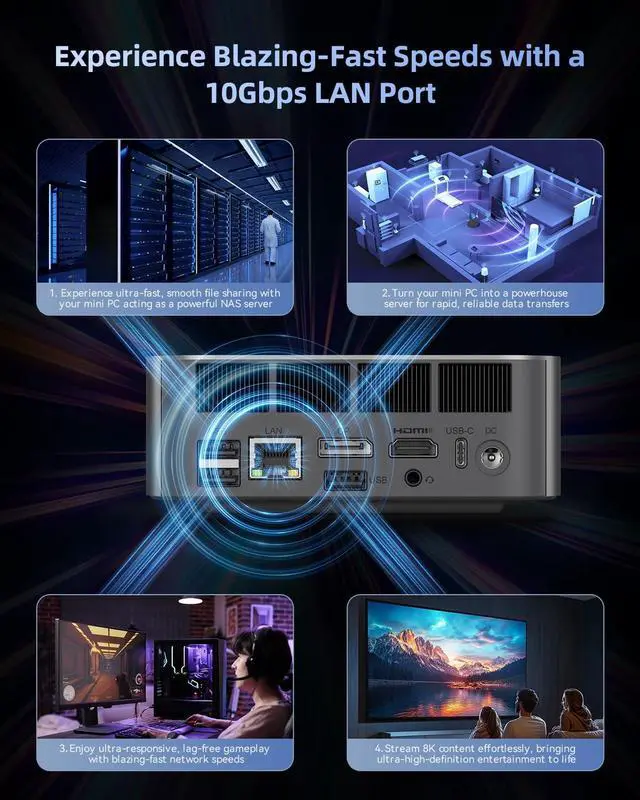 New Beelink Next-gen Powerhouse - Beelink SER9 MAX mini pc is powered by AMD Ryzen 7 H 255 processor, the new version of 8745HS ( 3.8GH z- 4.9GH z, 8 cores 16 threads, 16M L3 Cache, Zen 4 architecture, 40% performance boost over the Ryzen 7 7735HS). Perfect for streaming high-definition videos, editing high-resolution images, engaging in professional-level design work and playing AAA titles such as LOL, DOTA 2, PUBG, CS: GO, Forza Horizon 4 and etc ^^ 4K 240Hz Triple Displays - Beelink Ryzen 7 mini pc integrates an AMD Radeon 780M GPU with RDNA3 architecture, 12 cores and a top speed of 2600MHz. With HDMI 2.1, DisplayPort 2.1 & full-featured USB4 (40Gbps/PD/DP 1.4 ) on board, the SER9 MAX supports up to 4K@240Hz high-refresh-rate display for crisp, smooth visuals to power your gaming and content creation ^^ High-speed Memory & Expandable Storage - Beelink H255 mini pc comes with 32GB dual-channel DDR5 5600MHz RAM, expandable up to 256GB, and 1TB M. 2 PCIe 4.0 SSD (dual SSD slots, max 4TB*2). Large capacity helps to save more large programs in the mini computer and brings smoother operation of multi-tasking. High-speed SSD enables quicker load time of large files, high resolution content and large-scale games ^^ High-speed Network Connectivity - Beelink mini pc equipped with 10Gbps LAN port, dual-band WiFi 6 (Intel AX200), transmission speed up to 2.4G bps, three times faster than WiFi5. Lower latency Bluetooth 5.2 brings faster data transfer, more stable and efficient to connect to multiple wireless devices such as projector, printer, monitor, speakers and etc ^^ 32dB Near-Silent Desktop PC - Air intake from the bottom is so efficient at dissipating the heat that Beelink SER9 MAX needs very low fans peed to stay cool and stable at 65W TDP, ensuring near-silent operation