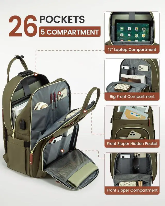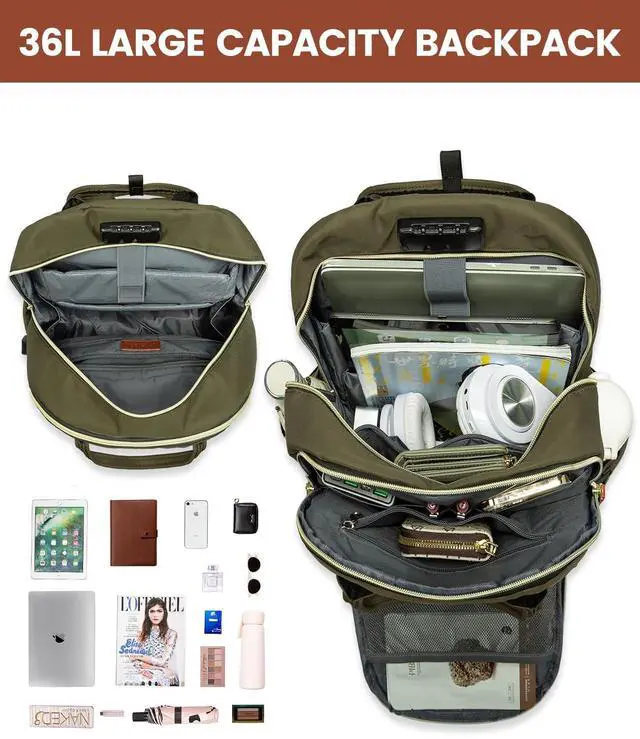 LARGE CAPACITYSIZE: 13"L 19"H 7.8"D. The large capacity laptop backpack has multiple divider pockets, easy for holding 17 Inches laptop, iPads, Phone, water bottle, umbrella, readers, journal, magazine, clothes, pens, wallet and so on. ^^ LOTS OF STORAGE SPACE&POCKETSThis large capacity backpack is ideal as a travel backpack. Including it has a separate laptop compartment hold 17 Inch laptop and a ipad compartment. The anti-theft backpack has a spacious packing compartment that can all roomy for daily necessities, tech electronics accessories. Front compartment with many pockets, an anti-theft pocket on the back and two water bottle pockets on the side, make your items organized and easier to find. ^^ ANTI-THEFT DESIGNThe laptop backpack with Fixed Password Lock and an anti-theft pocket on the back. It is safe guaranteed for protecting your valuable items inside. No need to worry theft easily opening your backpack when you are travelling or lining up. ^^ DURABLE MATERIALThe Laptop backpack is made of tear-resistant high-density nylon and polyester, durable and waterproof inside and out. The inner and outer parts of the backpack are stitched by padeds, which brings physical protection to your items and can play an absolute protective role.