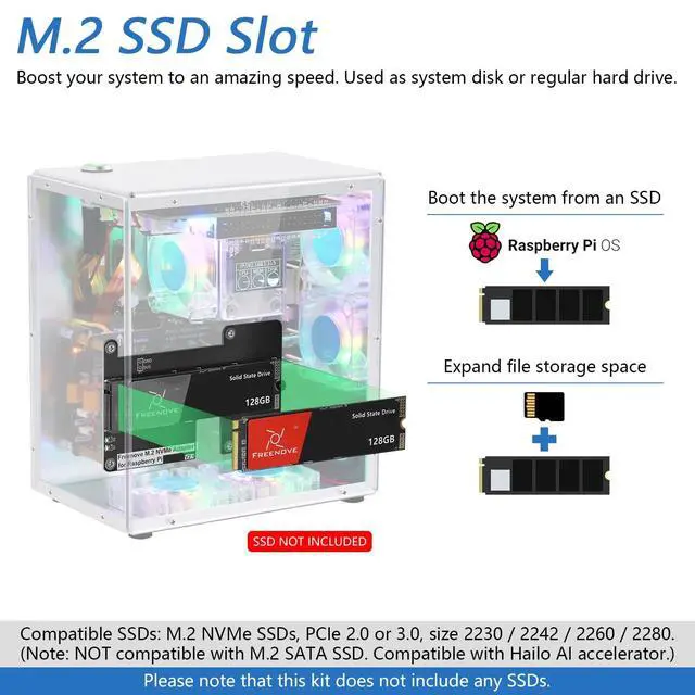 Important Notes: Compatible with Raspberry Pi 5 only, NOT included in this kit. Needs a 5V/ 5.1V 5A power supply and a memory card or SSD for the system.