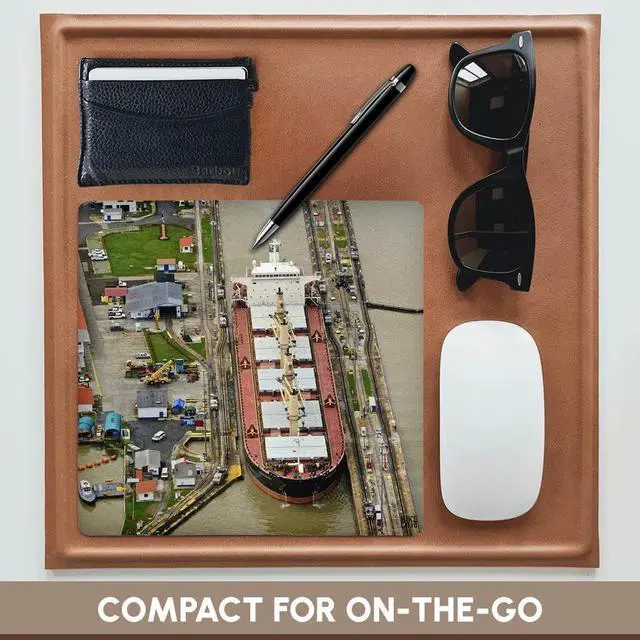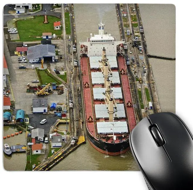 Container ship Panama Canal Mouse Pad is 8" x 8" x. 25" and is made of heavy-duty recycled rubber. Matte finish image will not fade or peel. Machine washable using a mild detergent and air dry.