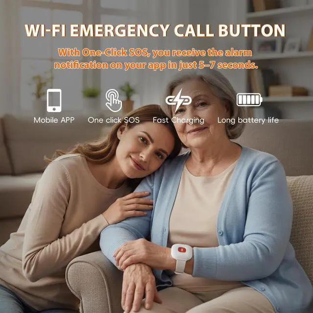 WiFi Wireless Caregiver Call Button: When help is needed, simply press the wristband SOS call button and caregivers will instantly receive an alert on their smartphone APP.