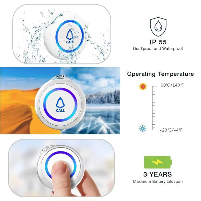 Immediate Assistance Whether you're a senior at home or a patient in the hospital, help is just a button press away. Its convenience and safety bring peace of mind to your life. ^^ Reliable Performance With a wireless Operation range of 1500 feet in open area, waterproof and dustproof design, and an operating range from -4F to 140F, it ensures reliable performance in various environments. ^^ Long-lasting Battery Powered by a CR2032 battery, the call button offers up to 3 years of continuous use, minimizing maintenance and ensuring uninterrupted service.
