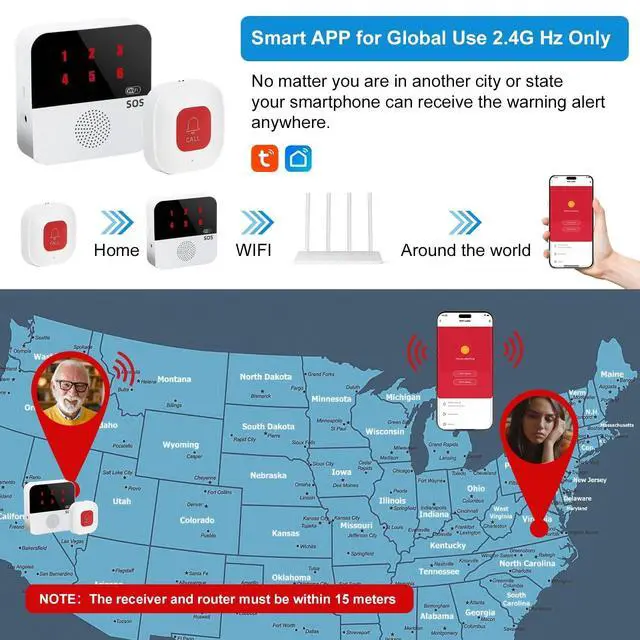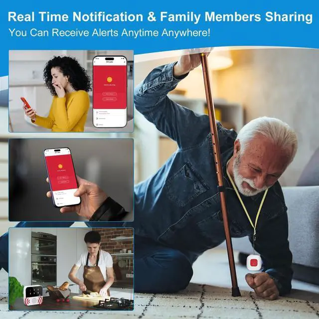 ^^ Meet your needsThis Wifi life alert systems for seniors is suitable for homes, hospitals, clinics, nursing homes and other places. Each button corresponds to a different number on the receiver, allowing caregivers to more easily identify who needs help ^^ No complicated Monthly FeeThe caregiver pager can be used without complicated monthly fees. One-touch button to seek immediate help (if you need additional phone SMS notifications, you must subscribe) ^^ Shared deviceConnect the phone to Tuya Smart or Smart Life to share the device with others. Press the panic button, and all shared people can receive APP notifications to provide multi-person protection.