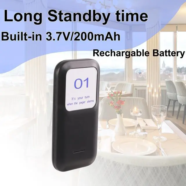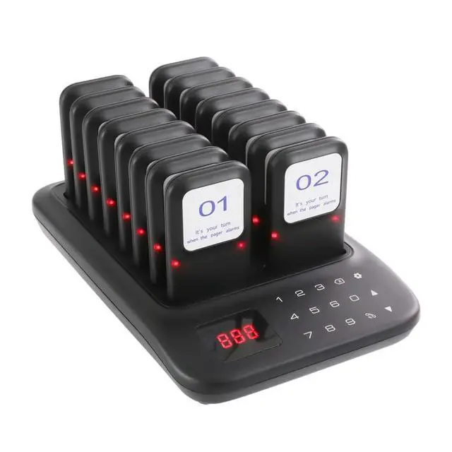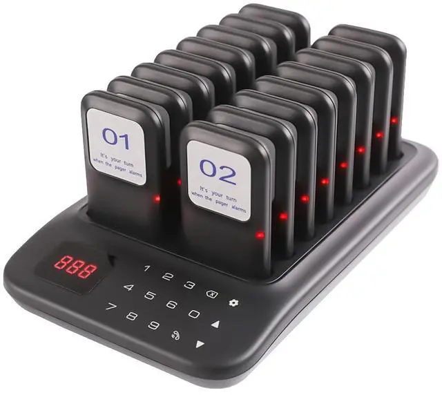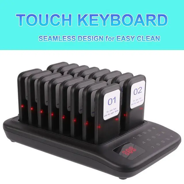 ^^ Enhanced Efficiency: Our pager system includes 1 keyboard base transmitter accompanied by 16 pagers. The transmitter supports the addition of numerous pagers at once, accommodating up to 998 pagers; this feature simplifies business expansion. ^^ Rechargeable Battery - Each receiver features a built-in 3.7V /200mAh lithium battery with a stackable charging design, which removes the requirement for regular battery replacements. ^^