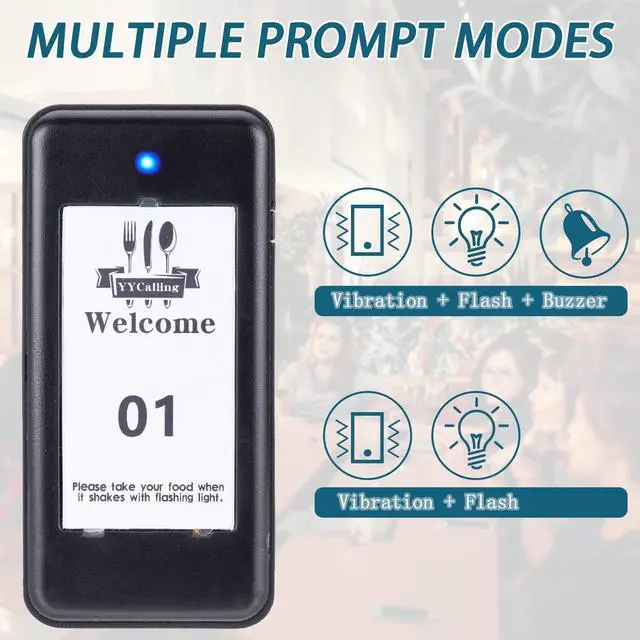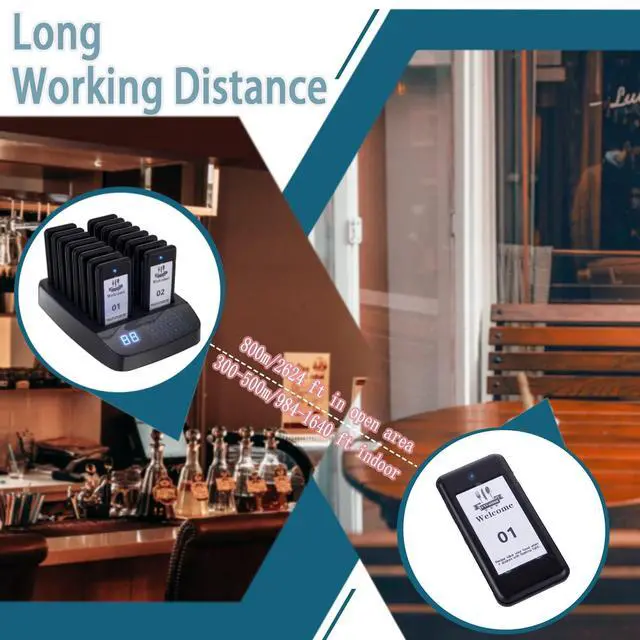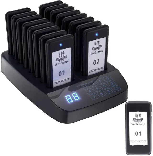 YYCALLING Wireless Calling SystemBased on 315MHZ radio-frequency, the indoor transmission distance is 984-1640 feet, and the open area can transmit up to 3280 feet/1000 meters, which can effectively reduce close contact and provide better safety protection measures for your employees, customers, and patients ^^ Calling Modes2 modes for restaurant paging system are vibration + flash + buzzer and vibration + flash, meeting different occasions. ^^ Rechargeable Battery 16 charging slots provide power whenever you put the pager on the base, so you don't have to worry about running out of power.