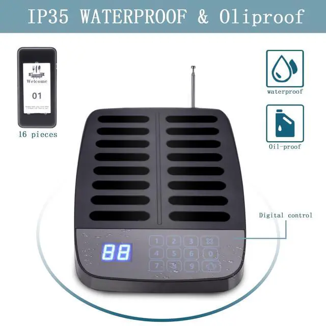 The pagers provide 24 hours of continuous use when fully charged (IP55 waterproof). ^^ Convenient and Efficient Save space effectively; this pager system puts visitors at ease and no need to look for parents in the congregation; when their children need help ^^ Durable And Easy CleanMatte surface resists oil and daily grime, easily wiped clean, designed for fast-paced food service conditions