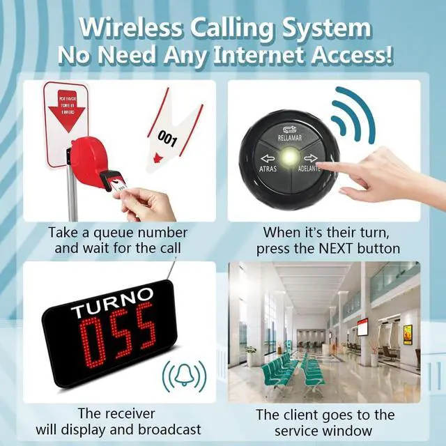 Note: The queue call system is programmed in Spanish, please be aware that we set the prompt voice to Spanish by default before shipping. 3 digit take a number system has a wide range of applications: Restaurant, coffee shop, fast food chain, food court, KTV, pub, service centre, clinic, government offices, supermarket or pharmacies, retail, patient waiting areas other queue and noisy occasions where queuing is required, greatly improving work efficiency. No need to stand and wait in line, customers can take a break while queuing without having to worry about waiting in a long line. --Plug and play, no wiring and expense required, it is ready to use when connected to the power supply. --It is easy to call the next/last number directly with one click, also can call the current number via RECALL key. --The simple ticket dispenser has a unique shape and eye-catching color to guide customers to pick up number ticket. Ticket roll inside can be purchased separately for replenishment when it run out. --When the display is in standby, you can adjust the volume by pressing the UP or DOWN key. --After pressing the UP and DOWN keys on the display at the same time, the number will return to 000 quickly.