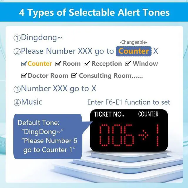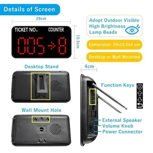Quick Zero: Suppose you have set the "Start" number to 10 and are currently calling 35. Press the Up and Down keys at the same time to quickly zero. When pressing the NEXT button, the number will start calling again from 10. Note that the "zero" here is not necessarily the number 0, but the "Start" number you set. ^^ The receiver consists of 3-digit ticket number and 1-digit counter number. The number display can be mounted on a wall or desktop. Easily adjust the volume, voice mode, number of broadcasts, cycle time, etc. The default voice mode is "Dingdong + Number XXX go to X" ^^
