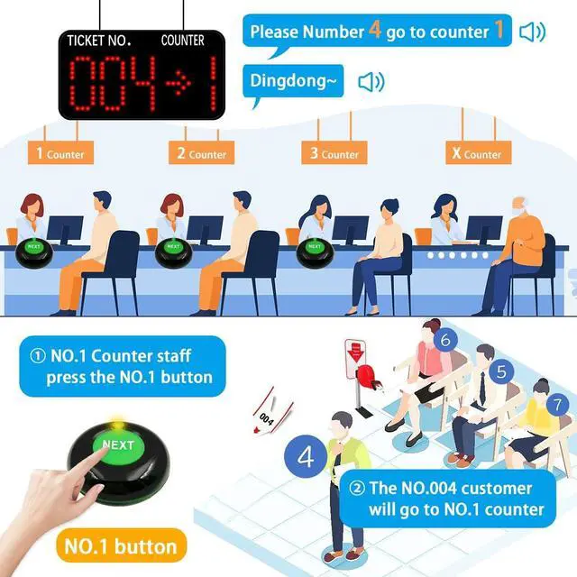 NEXT Button: It is a waterproof signal transmitter for the service personnel. When the "NEXT" button is pressed, the number will automatically go to the next one, accompanied by an indicator light prompt. It makes our queue wireless calling system simple and easy to use.