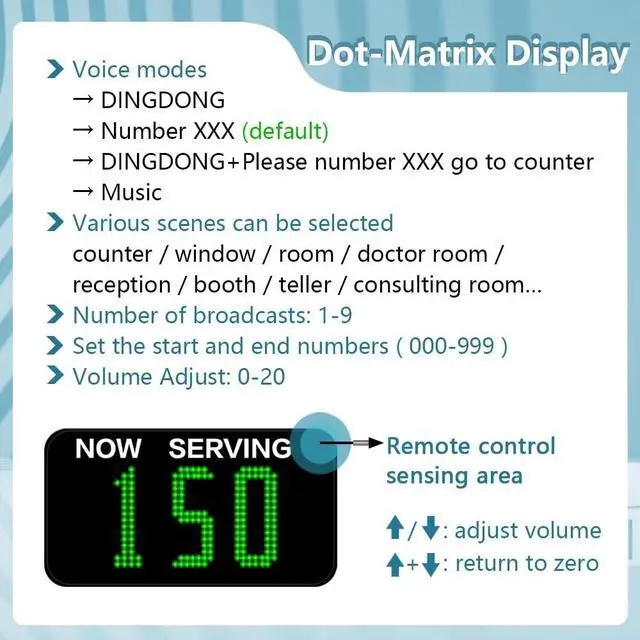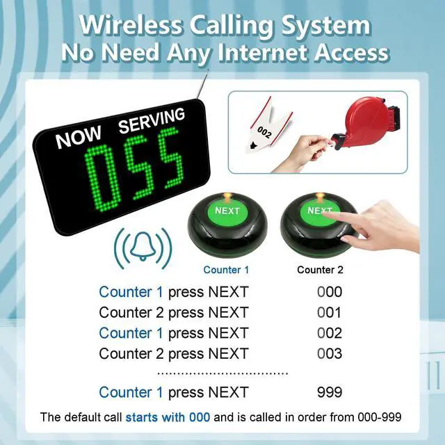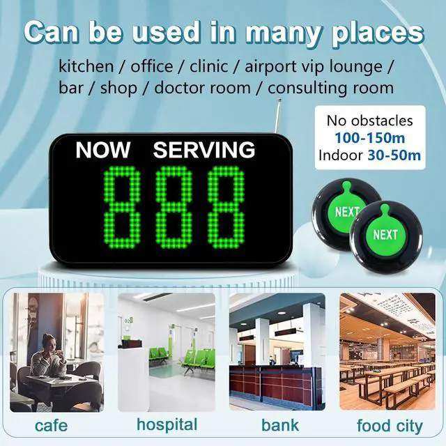 Freely Set Start and End Numbers: This queue system can store up to 999 numbers, and by default, the numbers are displayed sequentially from 001 to 999. You can limit the call range on the display, for example, setting it to 50-100. This feature enhances the flexibility of the wireless queuing system.