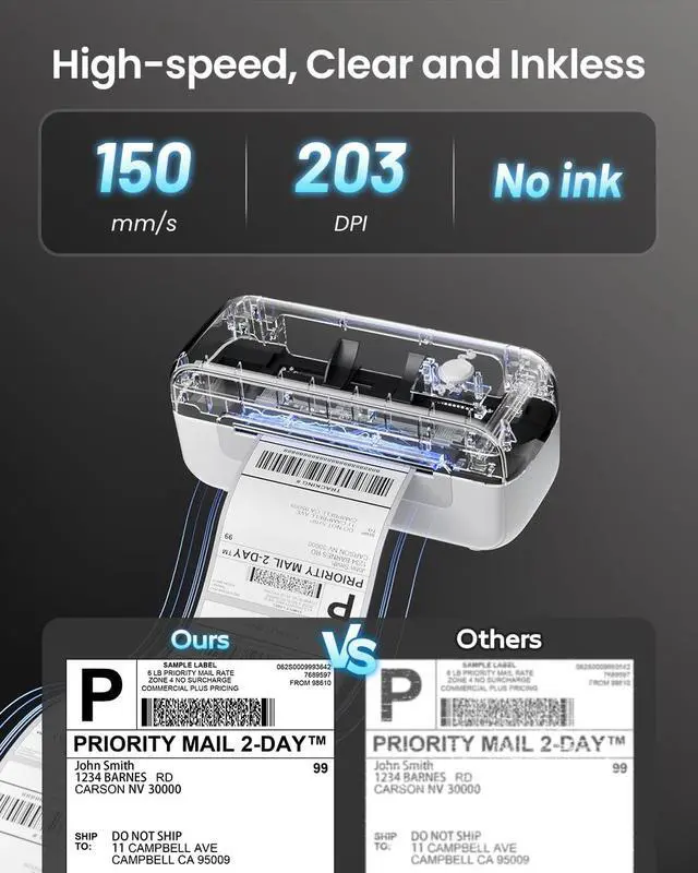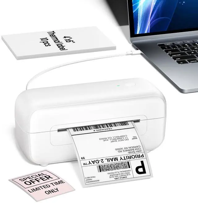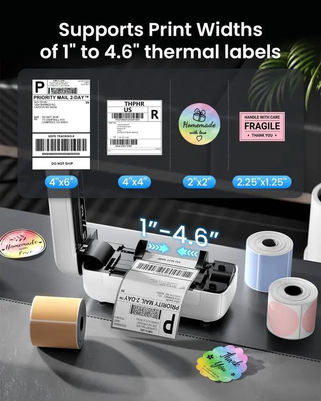 Multiple Sizes Thermal Labels: B246D thermal shipping label printer prints labels from 0.78" to 4.4" wide. Idea for 4"x6" shipping labels and barcode/postal/bulk mailing labels ect