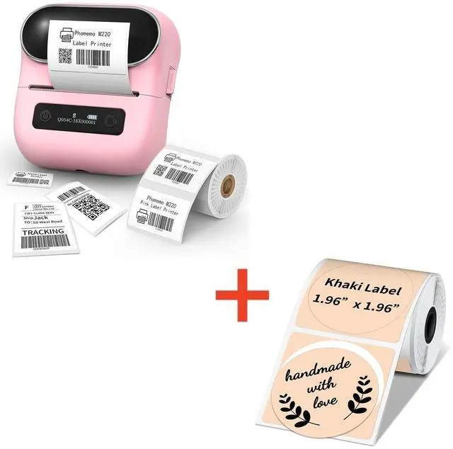 Phomemo M220 Label Maker & 1 Roll Khaki Circle Thermal Label, 1.96" x 1.96" 50x50 mm, Portable Sticker Label Maker Machine for Mailing, Storage, Address, Clothing, Home, Office, Pink
