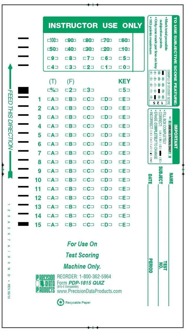 815-E Form size 3 3/8" x 6 1-side (500 Pkg) 15 Questions 5 Response Choices (A-E) Full Compatibility.