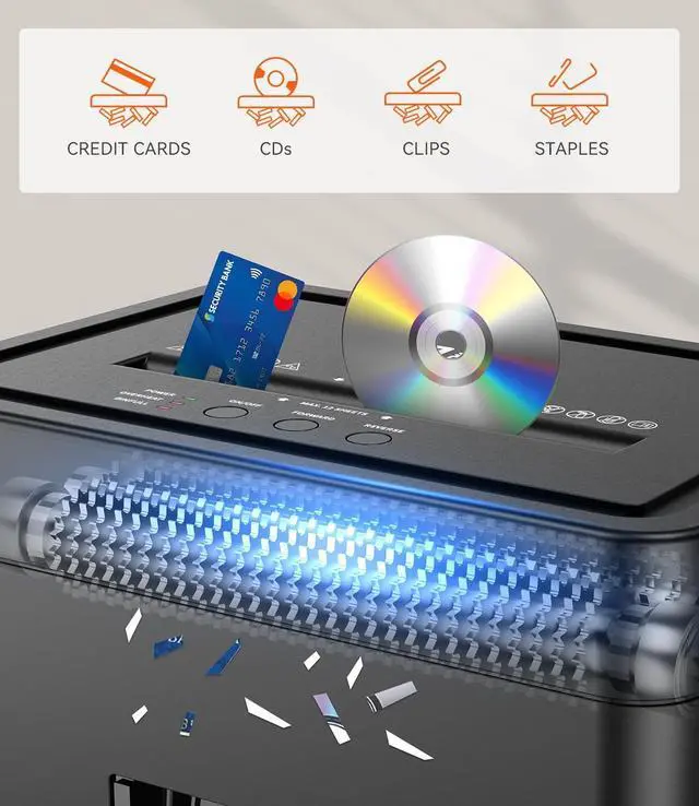 ^^ VERSATILE FUNCTIONALITY- In addition to paper, this shredder can shred credit cards and staples, offering comprehensive document handling capabilities. ^^ CONTINUOUS RUNNING- Allows continuous operation for up to 10 minutes in manual feed mode, making it ideal for home office use. ^^ STAY INFORMED- LED indicator lights provide updates on the shredder's status, including standby, overheat, bin-full, overload, and door open, ensuring you are informed about its operational condition. ^^ 1-YEAR WARRANTY & HIGH-QUALITY MATERIALS- Professional shredders come with a one-year worry-free warranty, even if the return window is closed.