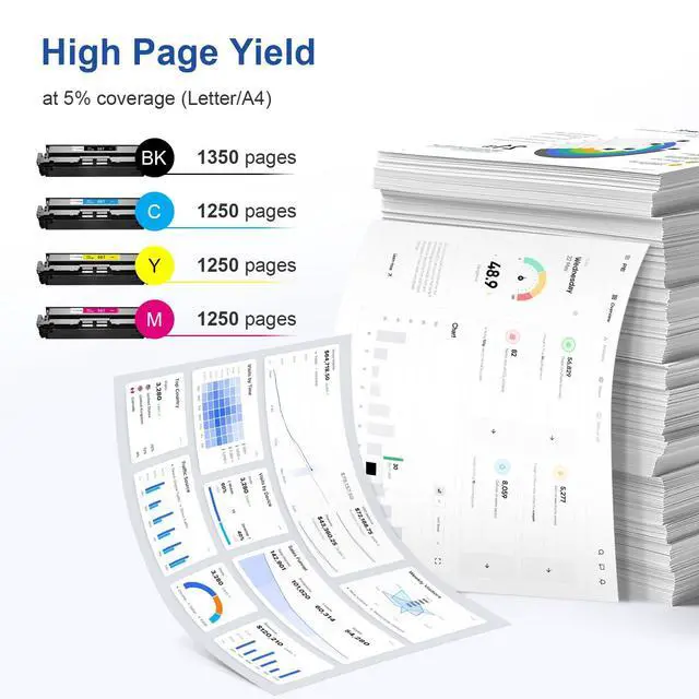 High Page Yield: Up to 1350 pages per Black Toner Cartridge and 1250 pages per Color Toner Cartridge (at 5% coverage/A4, depends on printer and usage) ^^
