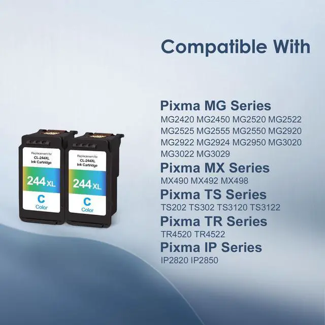 • FOR 244XL INK CARTRIDGES COMPATIBLE PRINTERSfor Pixma MG2420 MG2450 MG2520 MG2522 MG2525 MG2555 MG2550 MG2920 MG2922 MG2924 MG2950 MG3020 MG3022 MG3029 MX490 MX492 MX498 TS202 TS302 TS3120 TS3122 TR4520 TR4522 IP2820 IP2850 printers