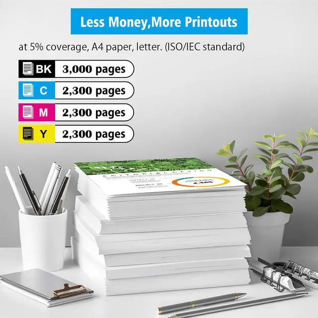 Page Yield: High Capacity 3000 Pages Black, Cyan Magenta Yellow 2300 Pages at 5% coverage, A4 paper, letter. (ISO/IEC standard). ^^