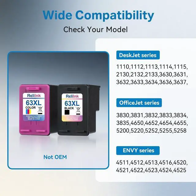 ^^ Wide Printer Compatibility: ReliInk 63 ink cartridges for hp printers are compatible with many printers, including HP OfficeJet 3830, 3831, 3832, 3833, 3834, 3835, 4650, 4652, 4654, 4655, 5200, 5220, 5252, 5255, 5258 and HP Envy 4511, 4512, 4513, 4516, 4520, 4521, 4522, 4523, 4524, 4525 and HP DeskJet 1110, 1111, 1112, 1113, 1114, 1115, 2130, 2132, 2133, 3630, 3631, 3632, 3633, 3634, 3636, 3637. Whether youre printing anywhere, this for hp 63 ink deliver consistent quality and smooth operation.