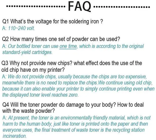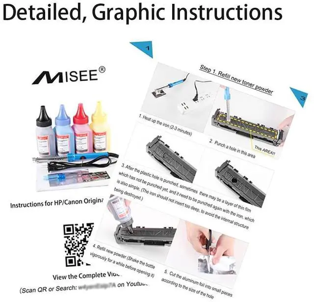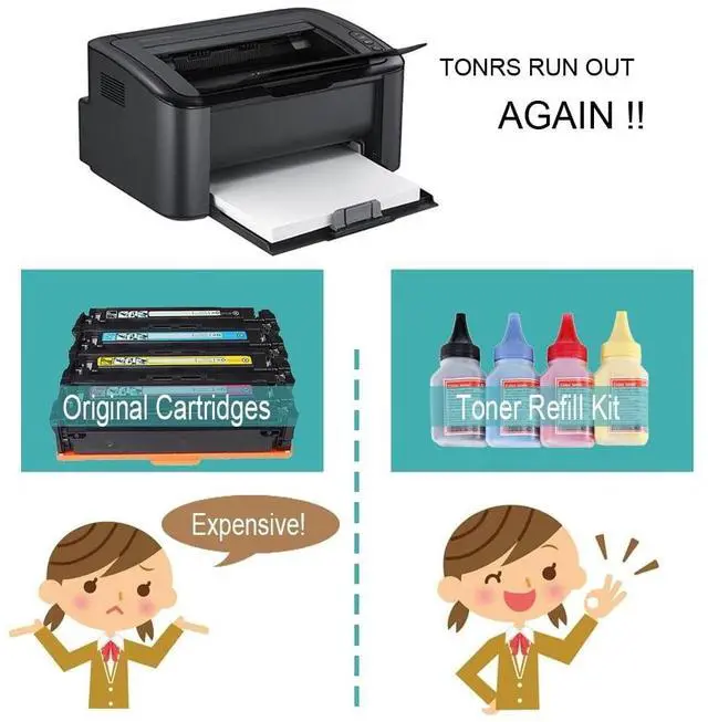 note: The amount of toner is 40 grams, which is standard and sufficient. But the volume of the powder in the bottle only accounts for one-third of the volume of the bottle. This is for ease of operation (the volume will become larger after shaking), please understand. 1x 40g black toner1x 40g cyan toner1x 40g yellow toner1x 40g megenta toner1x Hole Making Tool help you make a hole in order to fill the toner4x Screw-on funnels to pour the toner into the cartridges4x Tin foil -Seal the hole1x Detailed instructions with picturesUsed for