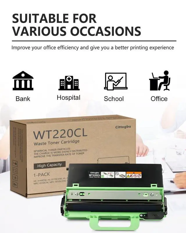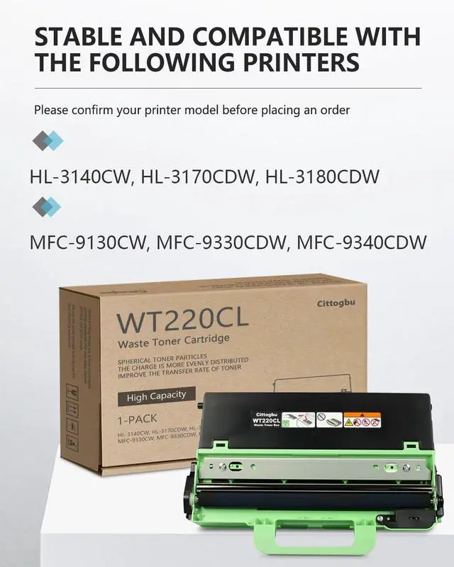 The product includes - 1 Pack WT-220CL Waste Toner Cartridge ^^ Pages Yield - WT220CL Waste Toner Cartridge up to 50000 pages, with a coverage rate of 5% (Letter/A4) ^^ Applicable printer - HL-3140CW HL-3170CDW HL-3180CDW MFC-9130CW MFC-9330CDW MFC-9340CDW Printers ^^ Strong compatibility - The WT 220CL waste toner cartridge has high compatibility and can be used for various brands and models of printers, perfectly matching the printer structure and making it easier to identify ^^ Tips - Though the TN221/TN225 toner cartridge and WT220CL/WT-220CL waste toner box are two separate components, they must be used together as a matched set.