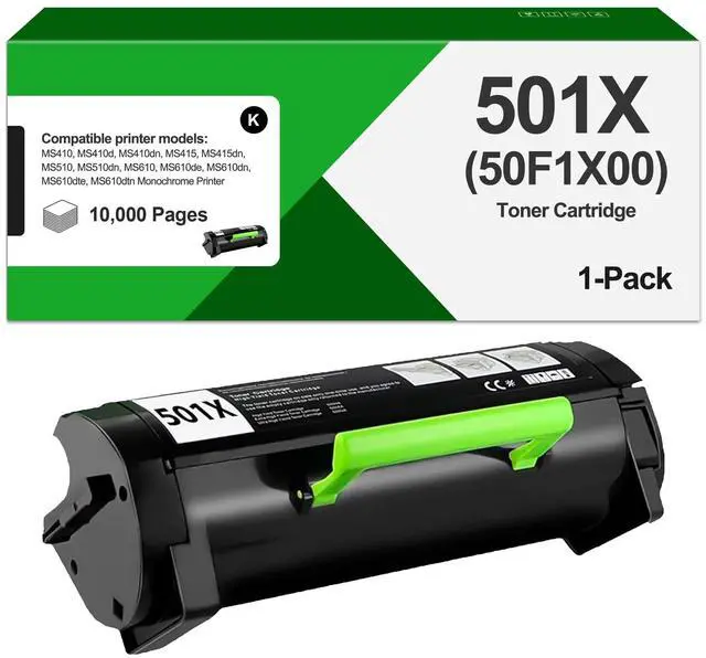 Included1 Pack compatible 501X 50F1X00 toner cartridge ^^ Replacement Toner CartridgeFor 501X 50F1X00 Toner Cartridge ^^ High Yield PageUp to 10, 000 pages per black 501X 50F1X00 toner cartridge at 5% coverage(Letter/A4) ^^ Compatible for Printers MS410, MS410d, MS410dn, MS415, MS415dn, MS510, MS510dn, MS610, MS610de, MS610dn, MS610dte, MS610dtn Monochrome Laser Printer ^^ Perfect Print Performance Our 501X toner cartridge delivers clean, sharp and crisp printouts, resisting fading, smudging and blurring as well as bringing you dependable printouts