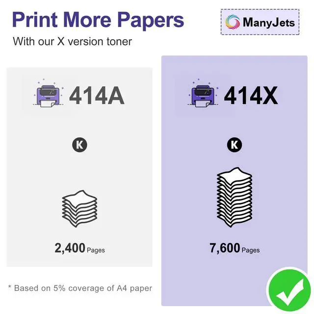 • With Smart Chip: No need to transfer or install the original 414X W2020X black toner chip during installation because the ManyJets compatible 414X Black High Yield Toner Cartridge come with UPGRADED CHIP and install easily
