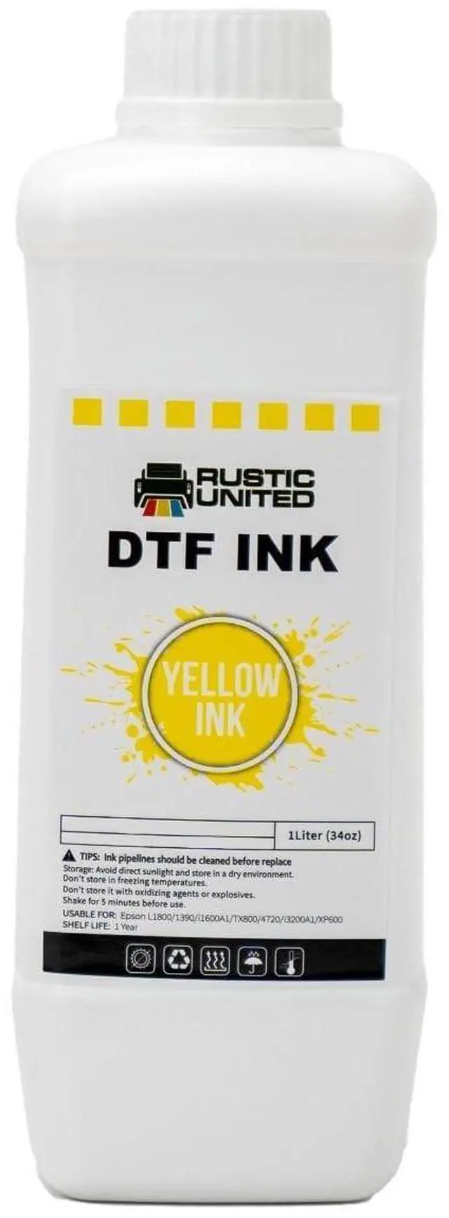Rustic United Premium DFT Ink is specifically formulated for creating vibrant, high-quality direct-to-film (DTF) prints that can be heat-transferred onto a variety of materials, including cotton, polyester, nylon, leather, hoodies, aprons, tote bags, and more. This non-toxic, water-based ink delivers sharp, clear designs and a solid base, ideal for adding vivid detail to your projects. Benefits of