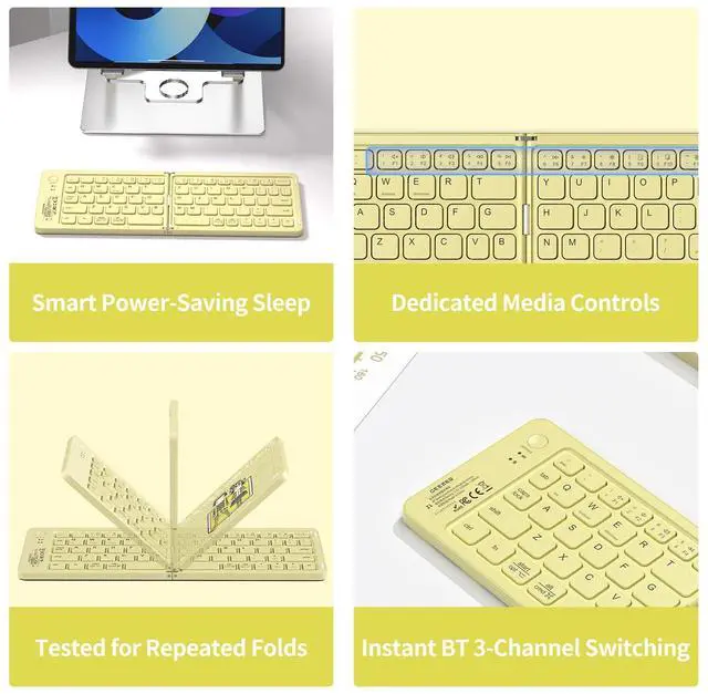 ithium battery capacity: 150mAhthe travel keyboard can be charged via the included Type-C cable, reaching full charge in just 2 hours. Unfolding the keyboard to work, folding the keyboard to sleep. The automatic on/off and reconnection feature enhances usability. the built-in lithium battery can work continuously for 40 hours or stand by for 180 days. One full charge is enough for your short-term business trip or vacation. ^^ Computer Keyboards - Auto-Sleep & Saving Energy Auto-sleep after 60-secinactivity, Work with a lower current while not in use, better saving energy and enabling a longer battery life. Press any key to reactivate the keyboard immediately. Better saving energy and enabling a longer battery life. Press any key to reactivate the keyboard immediately. ^^ Wireless