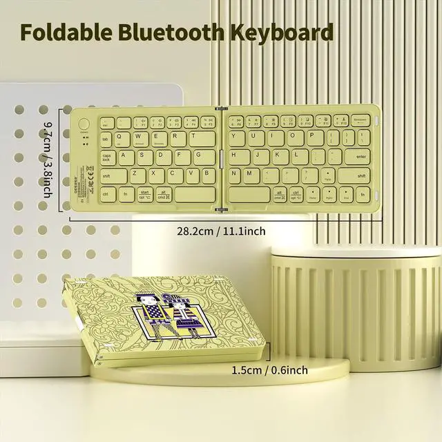 Use: Weighing only 5.93 ounces, this palm-sized travel keyboard folds easily to fit into your pocket or backpack. Simply press the CONNECT button for quick pairing with your devices. The automatic on/off and reconnection feature enhances usability. Whether you're traveling, working in a coffee shop, or just need a keyboard that doesn't take up much space, this pocket-sized keyboard is an ideal choice. It offers convenience and functionality in a small package. size 11.1 * 3.8 * 0.35 inch (open), 5.5 * 3.7 * 0.6 in (folded). ^^ Multi-device Bluetooth tablet KeyboardOur foldable keyboard with triple Bluetooth channels, which will maintains stable connectivity and fast response within 33ft operating range(Note: Turn on the Power button before connecting). Connectivity Technology Bluetooth 5.0. Supports up to 3 devices such as ipad, smartphone, tablet or laptop. It can be your perfect partner to help you reply to emails, edit excel sheets. ^^ Handheld Keyboard Rechargeable &